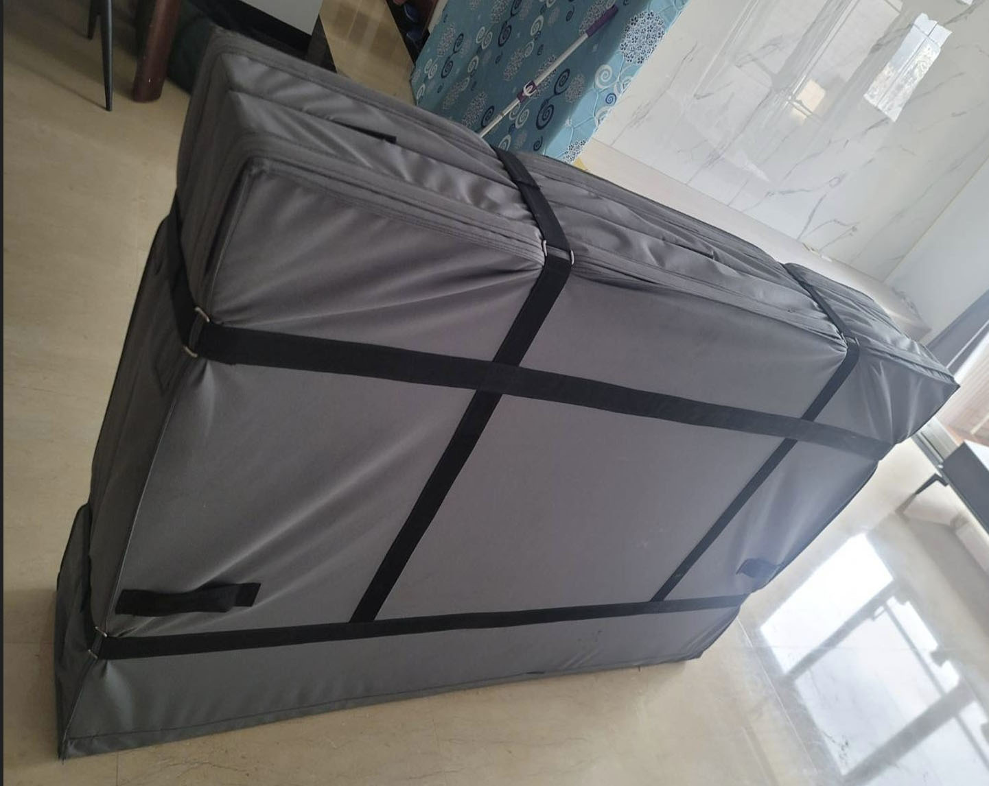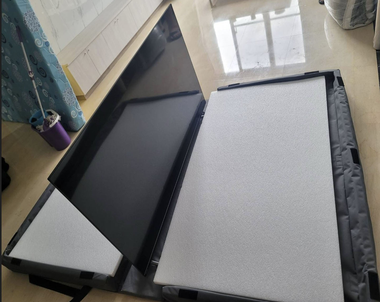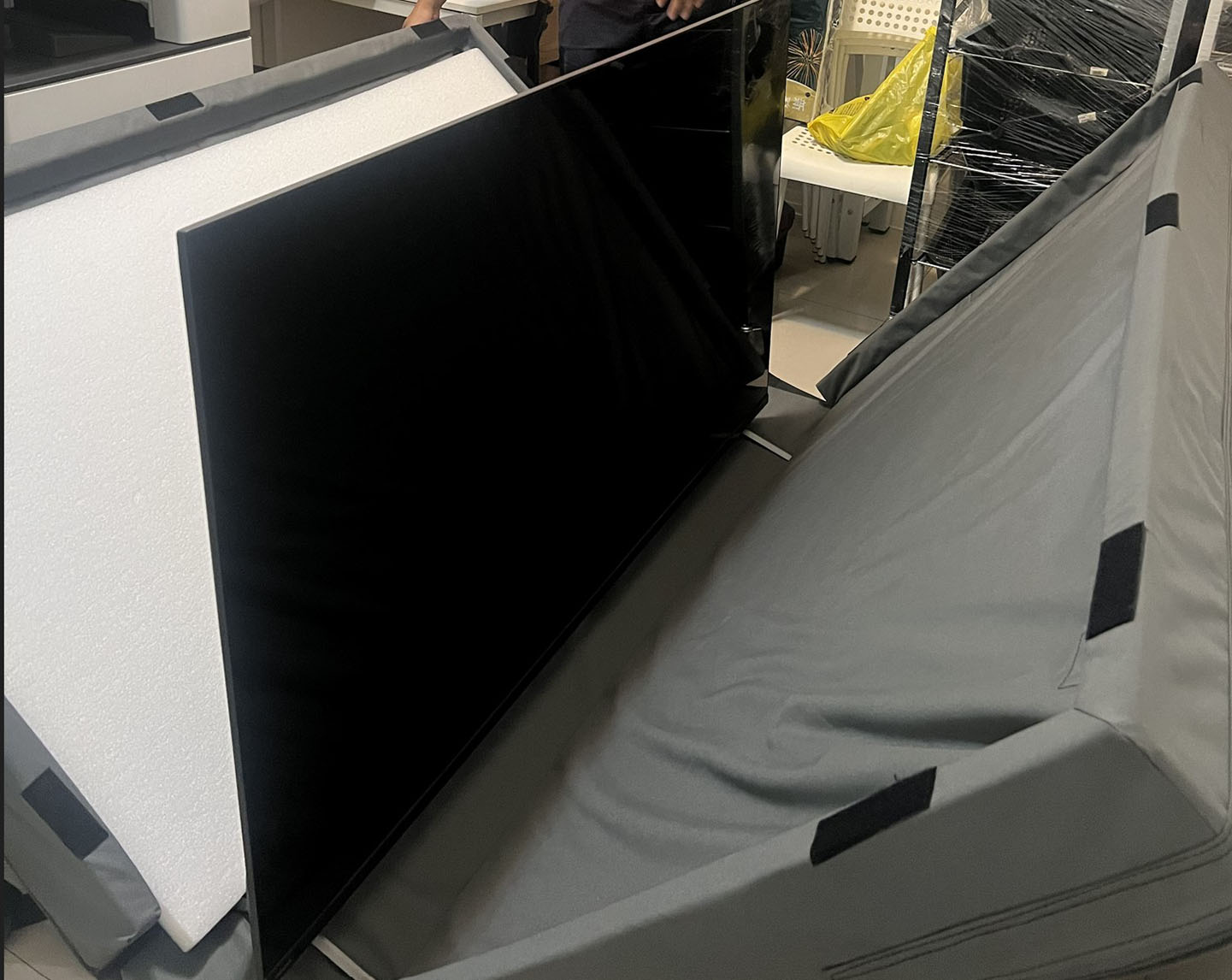 組合式打包盒,採魔鬼氈設計,可輕鬆調整大小,適合市面上多種尺寸的電視,使用特殊材質,取代一般紙盒,增強保護強度。打包時會在四邊角處放置保麗龍吸震墊,固定電視不搖晃,避免螢幕碰撞受損,周圍也會放置保麗龍,填補空隙,提高防護、減少摩擦,提昇保護力,多重保護讓搬運過程,達到最佳保障。